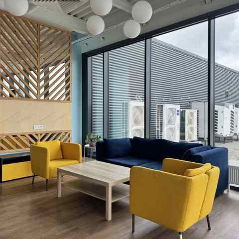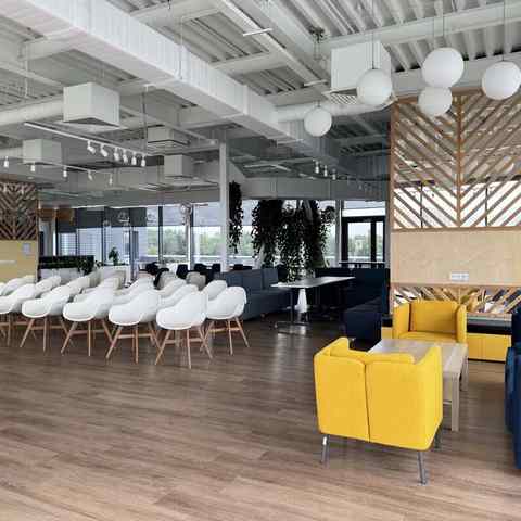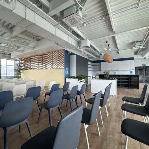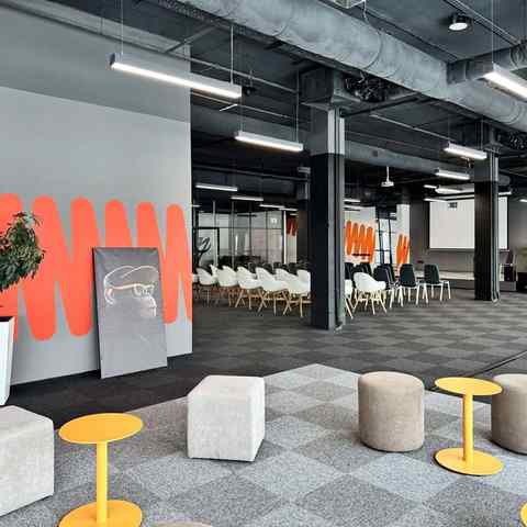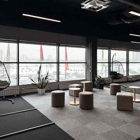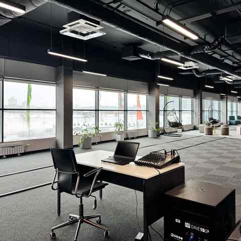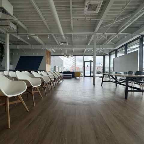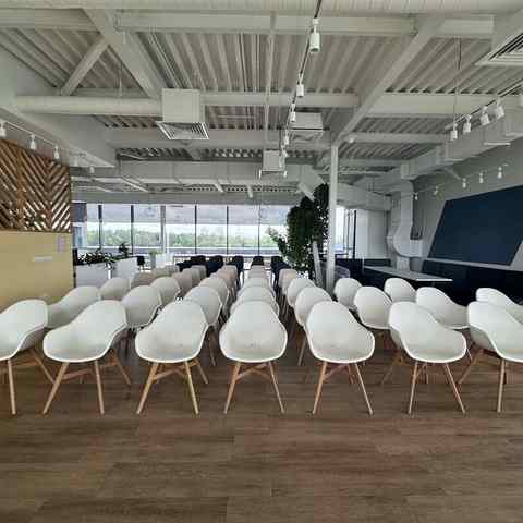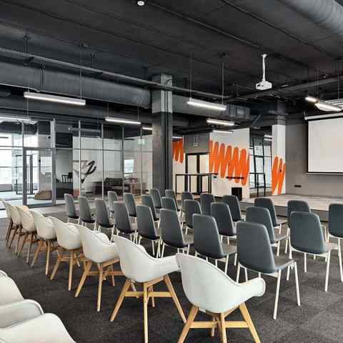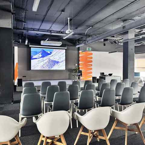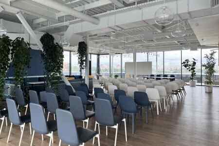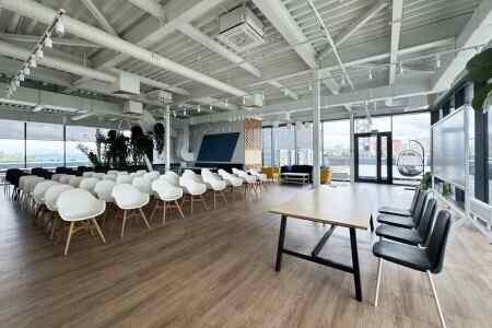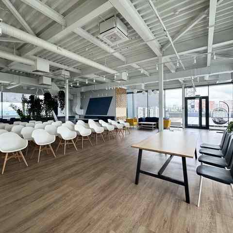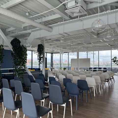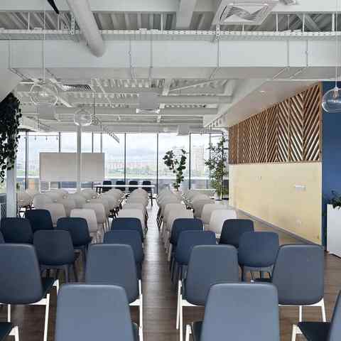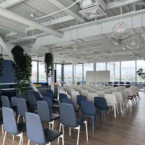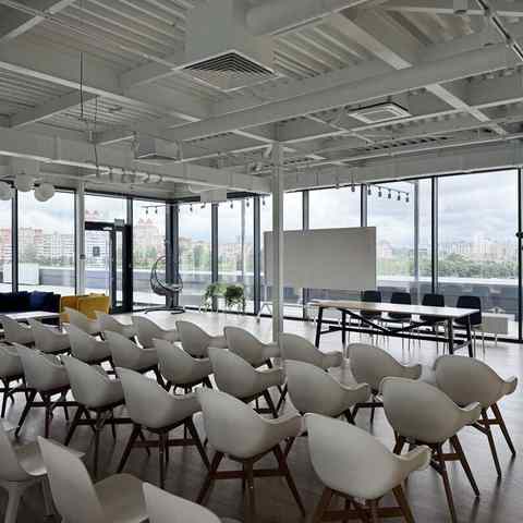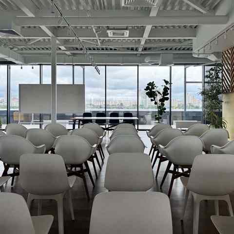 Пространство занимает отдельный этаж бизнес-центра и вмещает до 120 человек при театральной рассадке. Зал с панорамным остеклением по периметру наполнен светом и визуально расширяет пространство. Из него предусмотрен выход на террасу, идеально подходящую для кофе-брейков и неформального общения. Для гостей доступны основная и дополнительная парковки, а также переговорные комнаты для индивидуальной работы или встреч в небольших группах.