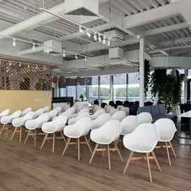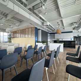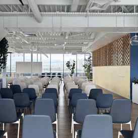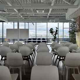 Пространство занимает отдельный этаж бизнес-центра и вмещает до 120 человек при театральной рассадке. Зал с панорамным остеклением по периметру наполнен светом и визуально расширяет пространство. Из него предусмотрен выход на террасу, идеально подходящую для кофе-брейков и неформального общения. Для гостей доступны основная и дополнительная парковки, а также переговорные комнаты для индивидуальной работы или встреч в небольших группах.